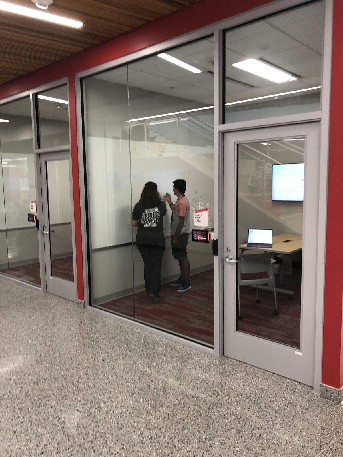 Students can book time in one of the huddle rooms, located throughout the building, with the EngiNEAR Me mobile app. Each huddle room contains a monitor with wireless projection capability in addition to a desk and whiteboard.